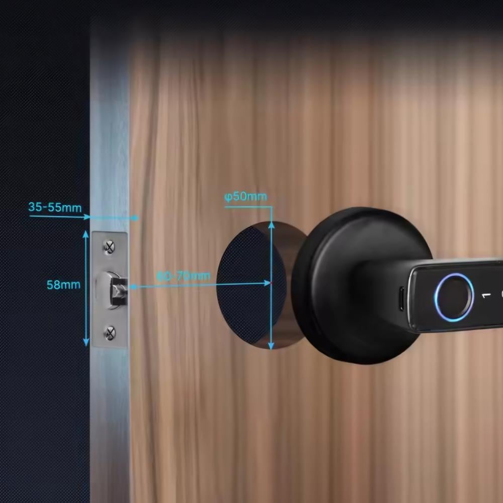 يمكنك فتح القفل عبر: بصمة الإصبع، كلمة المرور، بطاقة IC، تطبيق الجوال (Bluetooth)، أو المفتاح التقليدي.