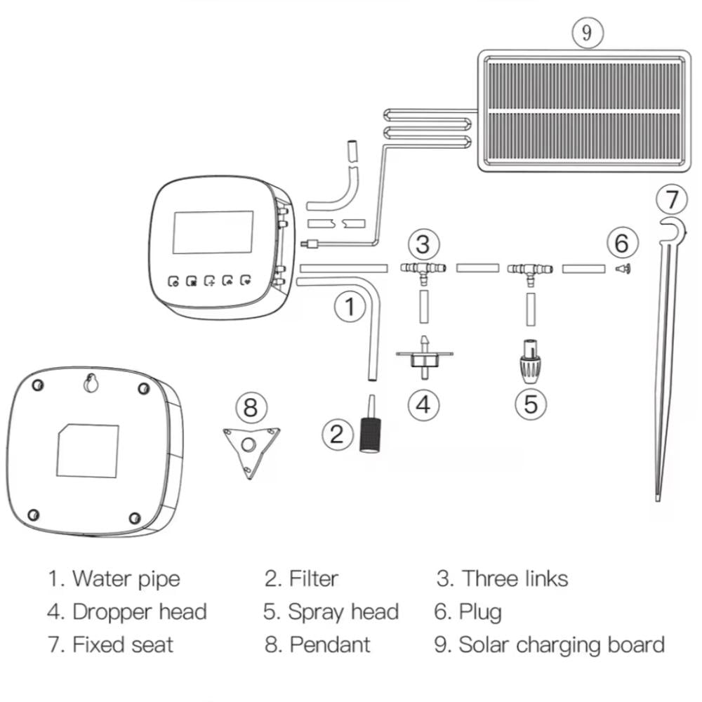 - ملحقات التغليف: لوحة شمسية * 1 (اختياري) + جهاز الري*1 دليل المنتج*1 + التوصيل * 2 + رأس الري بالتنقيط*8 + شهادة التفتيش * 1 + أنبوب شعري * 10+ ورأس الرش * 2 + فلتر*2 مع مقعد ثابت*10، وموصل تي * 1 وقلادة * 1.